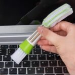 One end features fine microfiber cloth-covered prongs to get into tight vent supports, while the other end has stiff bristles to clean tough dirt.